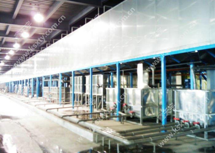 藥水通過噴淋對工件表面進行處理,由于噴射產生一定壓力工件表面能得到較好沖洗效果具有大批量連續作業之特點,但一次性投資相對較大藥水用量較大.適用于較長及簡單的表面處理。